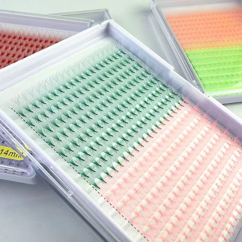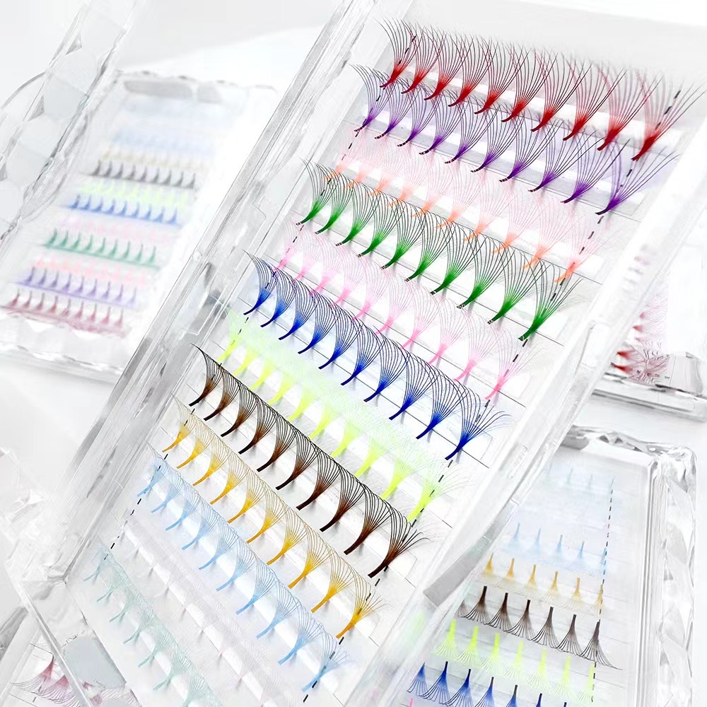Vibrant Colored Premade Fan Eyelashes Extension available in short stem, long stem, and pointy base styles. Perfect for creative lash brands and salons. Support full OEM/ODM customization with private logo, color mix, and packaging options.